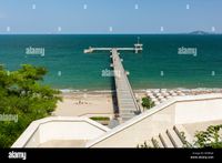Download this stock image: Beautiful Black Sea landscape from Burgas, Bulgaria. Summer seascape of Burgas bay. View of Burgas bridge. Umbrellas and sunbeds on the beach. - W5DKJ4 from Alamy's library of millions of high resolution stock photos, illustrations and vectors.